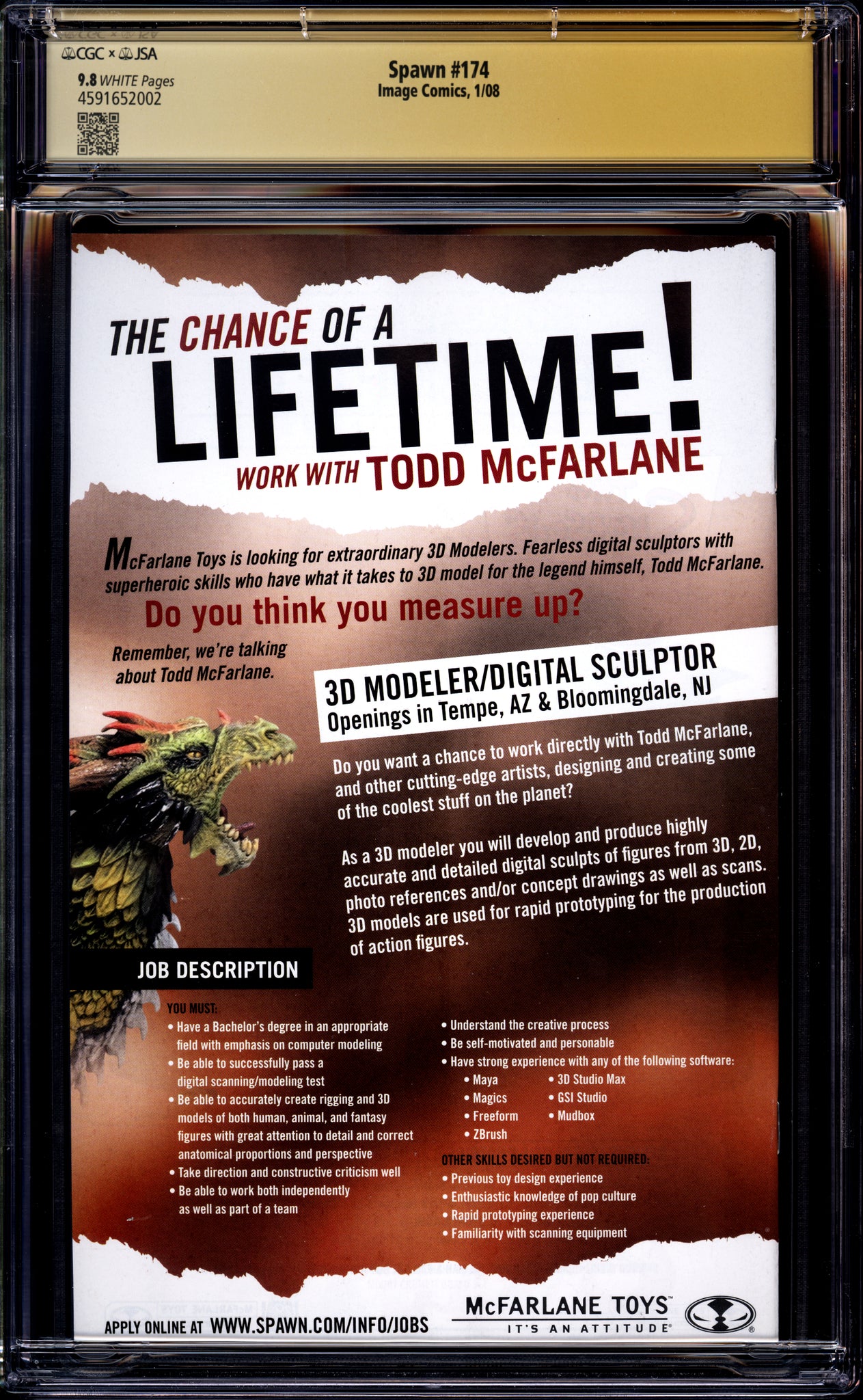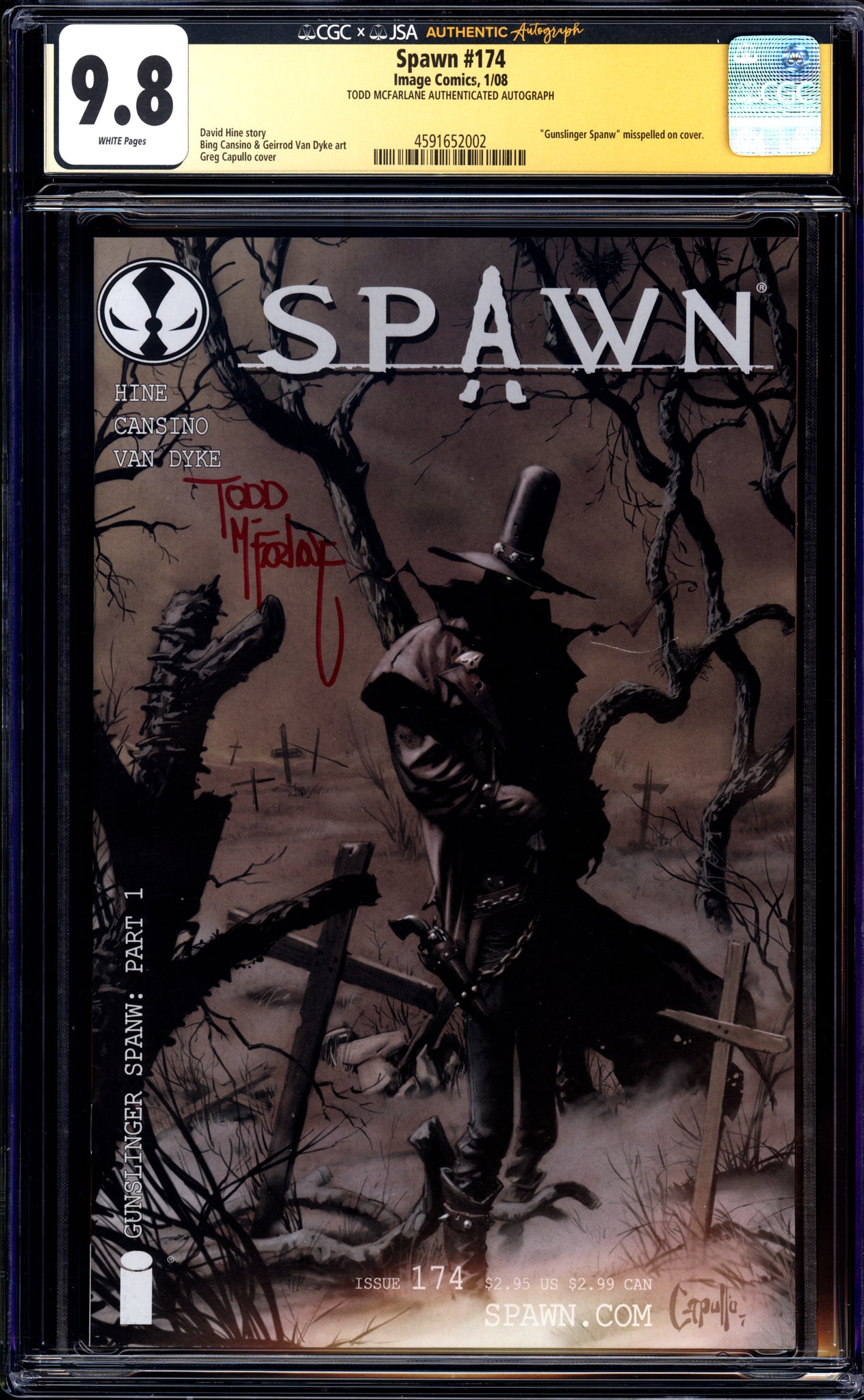 Spawn #174 CGC 9.8 (2008) Signed by Todd McFarlane! "Spanw" Error
